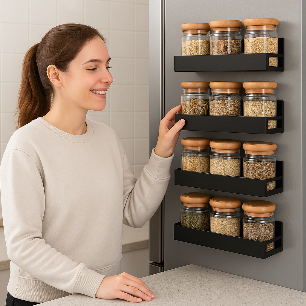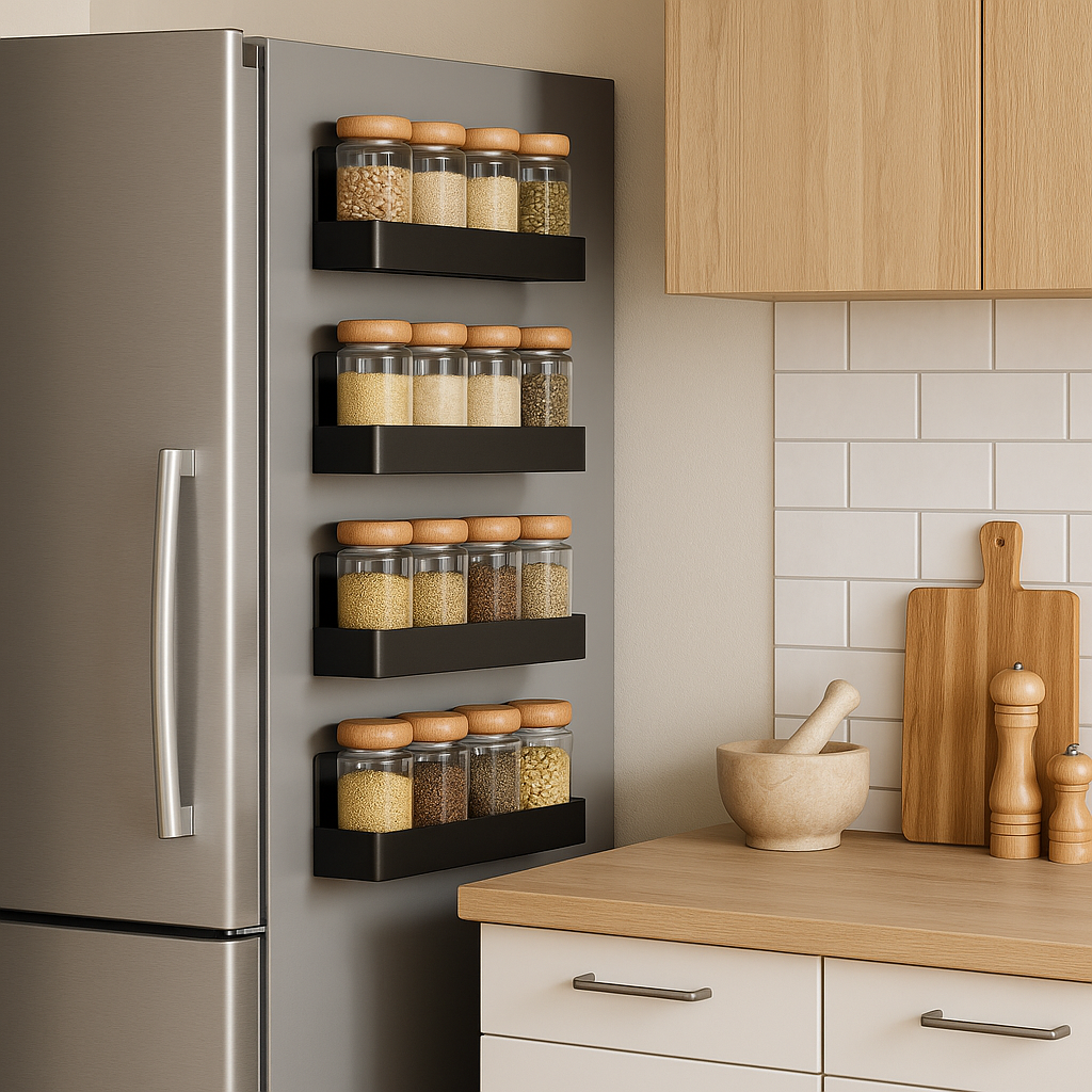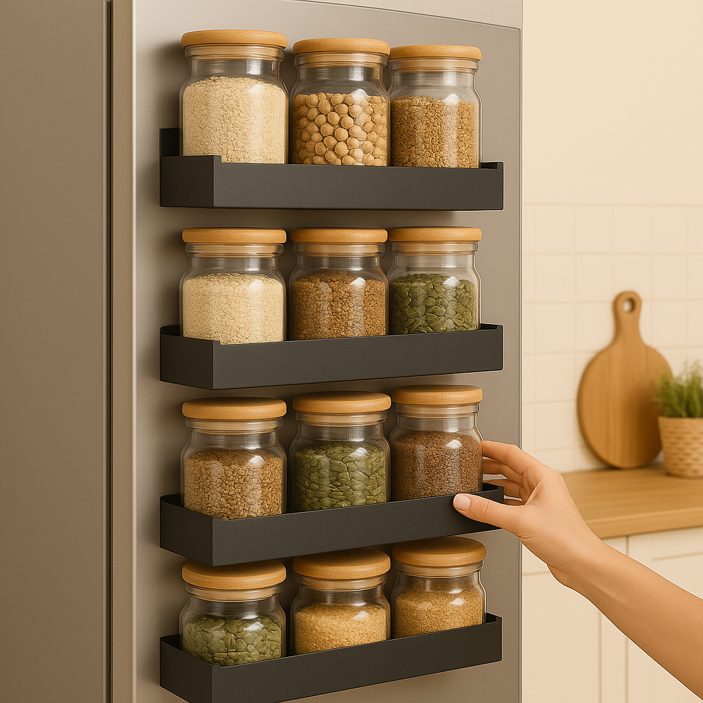 Incluye 4 estantes magnéticos + 8 ganchos plásticos + una guía descargable ''Cocina sin caos''